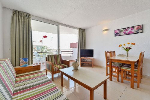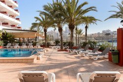 The Lido Apartments are located in the city of Ibiza, 1 km from the center in the neighborhood of Es Vivé. Just in front of the building runs the promenade that borders the entire Playa den Bossa. It is to say that the Apartments are the ideal starting point in two directions; Playa d'en Bossa with its many attractions (Bora Bora, Space nightclub, Tantra bar and lots of beaches) and Ibiza Town with everything it has to offer (shops, restaurants and bars). Both the city and the beach can be reached on foot or by bus; the stop is right in front of the reception. The Lido Apartments have a large private terrace with its own pool, one large and one small for children. The sun loungers on the terrace are free, there is also a cafeteria and a bar that offer tapas, and a daily menu at noon.