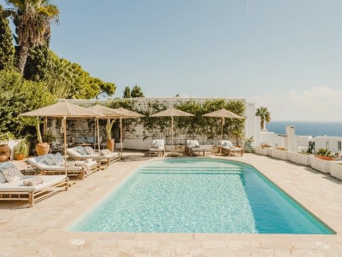 Stunning villa with sea views situated in Cap Martinet, just 5 km from Ibiza Town. This villa features 6 exquisite suites: the master bedroom on the main floor includes an en-suite bathroom, sea views, a spacious private lounge terrace, and a walk-in wardrobe. There are also two double bedrooms, each with en-suite bathrooms, sea views, and direct access to the pool area. Additionally, there’s a large double bedroom with an en-suite bathroom and its own lounge terrace, a double bedroom with a bathroom and a sizable TV room that also leads to the pool area, and another double bedroom with an en-suite bathroom. The house provides luxurious Egyptian cotton sheets and towels. The living room is bright and furnished with designer pieces, and there's a cinema room with a large flat-screen TV located by the pool, ideal for relaxing out of the sun. The kitchen is fully equipped with two built-in fridges, a freezer, two dishwashers, a Nespresso coffee machine, and a juicer, along with four wine fridges near the dining table.